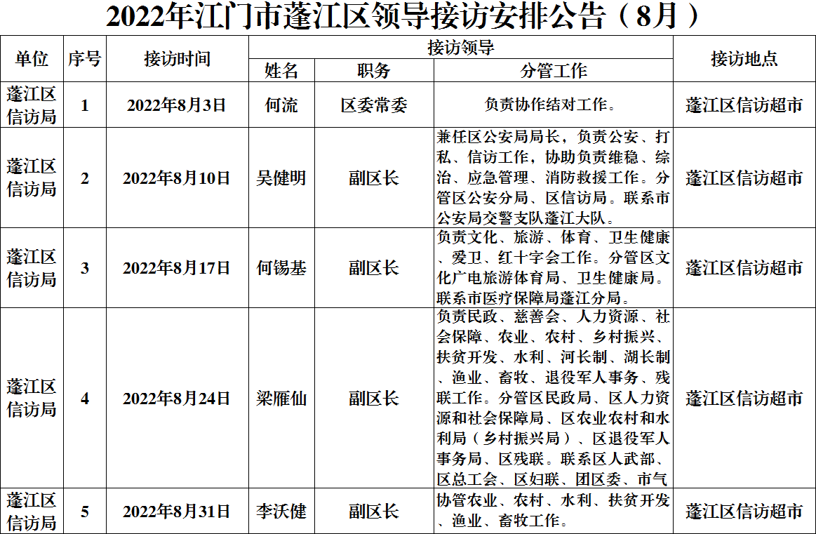 2022年江門市蓬江區領導接訪安排公告(8月)