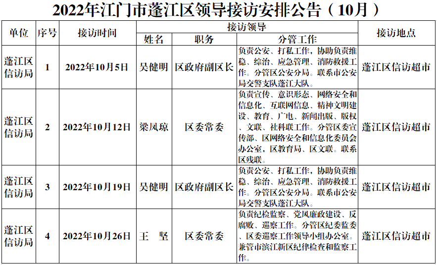 2022年江門市蓬江區領導接訪安排公告(10月)