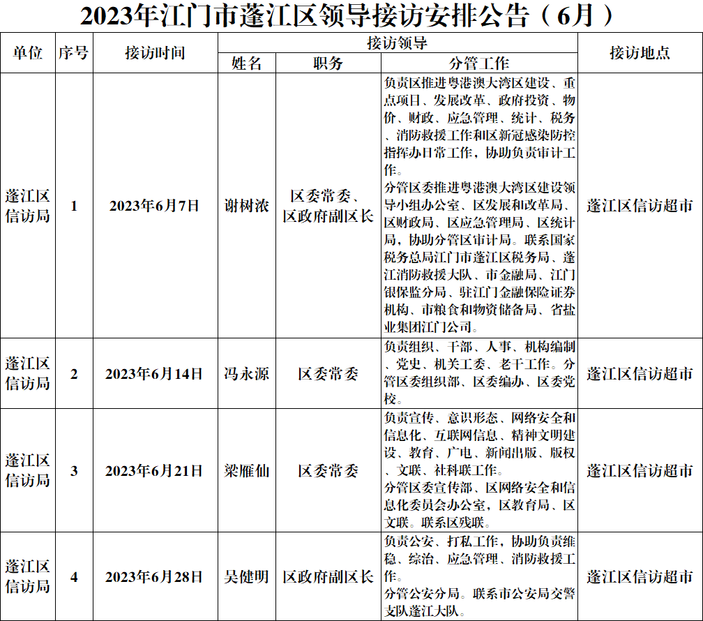 2023年江門市蓬江區(qū)領(lǐng)導接訪安排公告(6月)