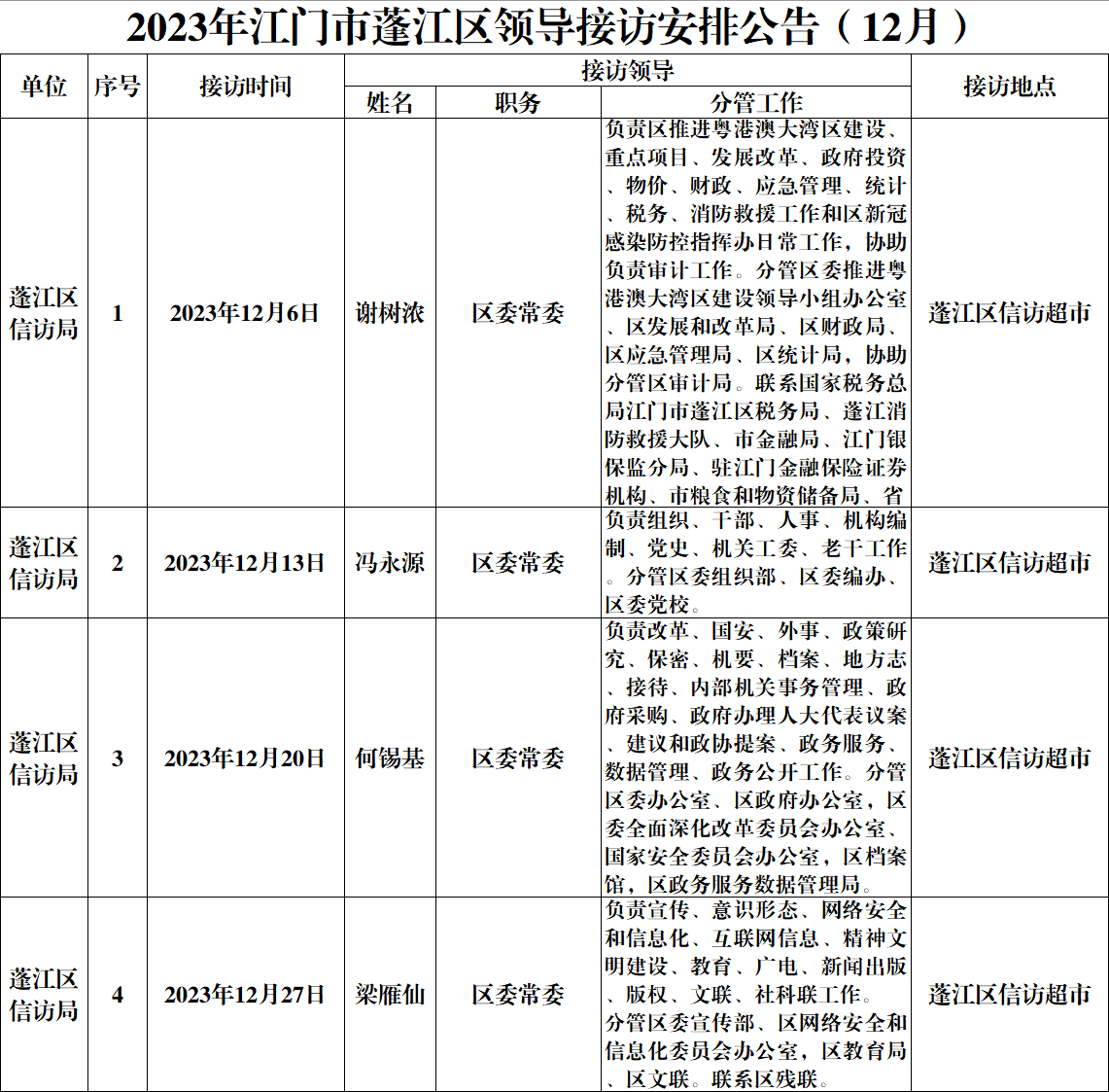 2023年江門市蓬江區(qū)領(lǐng)導(dǎo)接訪安排公告(12月)