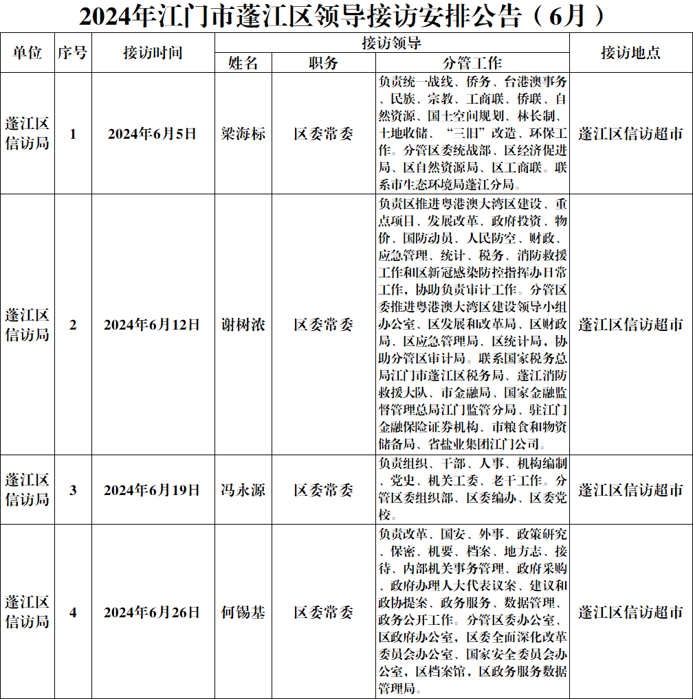 2024年江門市蓬江區領導接訪安排公告(6月)