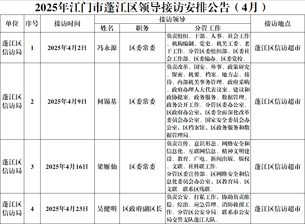 2025年江門市蓬江區領導接訪安排公告(4月)