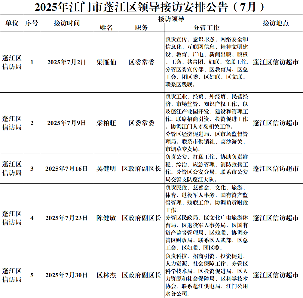 2025年江門市蓬江區(qū)領(lǐng)導(dǎo)接訪安排公告(7月)
