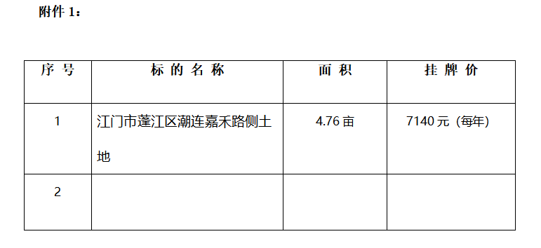 (一)基本情況:出租地塊位于:江門市蓬江區(qū)潮連嘉禾路側土地(詳見附件1)。土地租賃年期:2年,自簽訂交地確認書之日起計。