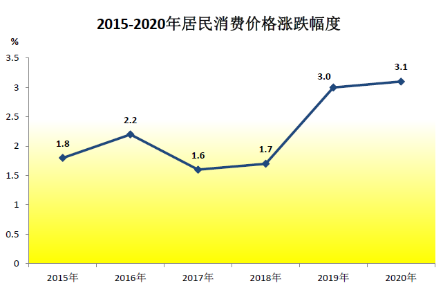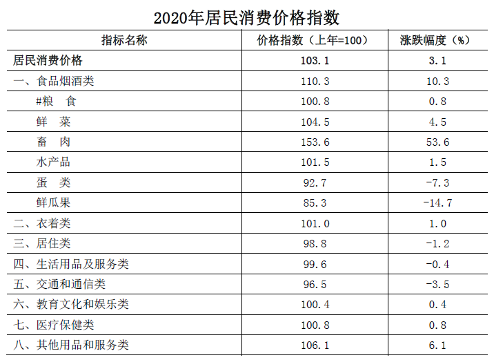 全年居民消費價格比上年上漲3.1%。分類別看,食品煙酒類價格上漲10.3%,衣著類價格上漲1.0%,居住類價格下降1.2%,生活用品及服務類價格下降0.4%,交通和通信類價格下降3.5%,教育文化和娛樂類價格上漲0.4%,醫療保健類價格上漲0.8%,其他用品和服務類價格上漲6.1%。工業生產者出廠價格下降1.3%,商品零售價格上漲1.7%。