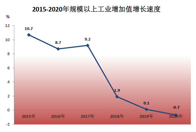 全年規模以上工業增加值比上年下降0.7%。分注冊類型看,國有及國有控股企業下降4.2%,外商及港澳臺投資企業增長0.7%,股份制企業下降1.1%,集體企業下降58.8%;分輕重工業看,輕工業下降5.5%,重工業增長2.4%;分企業規模看,大型企業下降0.5%,中型企業增長4.1%,小型企業下降3.4%,微型企業下降25.2%。