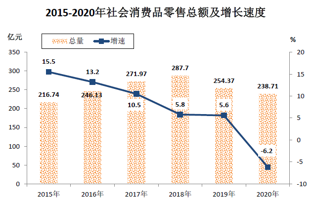 全年社會消費品零售總額238.71億元,比上年下降6.2%。分行業看,限上批發和零售業零售額106.76億元,下降10.5%;限上住宿和餐飲業零售額7.38億元,下降14.08%。
