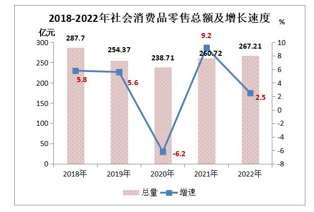 全年社會消費品零售總額267.21億元,比上年增長2.5%。其中,限上批發和零售業零售額137.39億元,增長5.1%;限上住宿和餐飲業零售額10.51億元,增長0.6%。