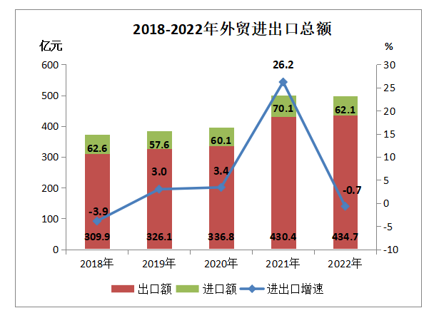 全年外貿進出口總額496.8億元,比上年下降0.7%。其中,進口62.1億元,下降11.5%;出口總額434.7億元,增長1.1%。實際利用外資3.26億元,增長9.5%。